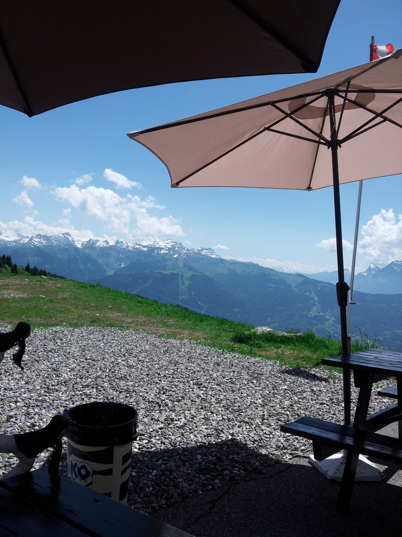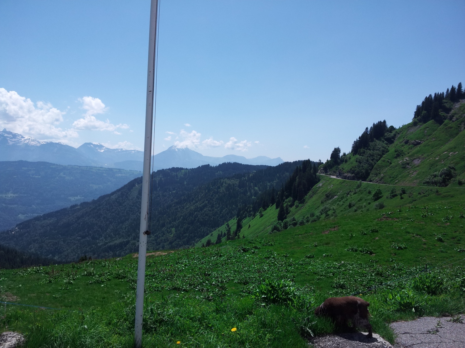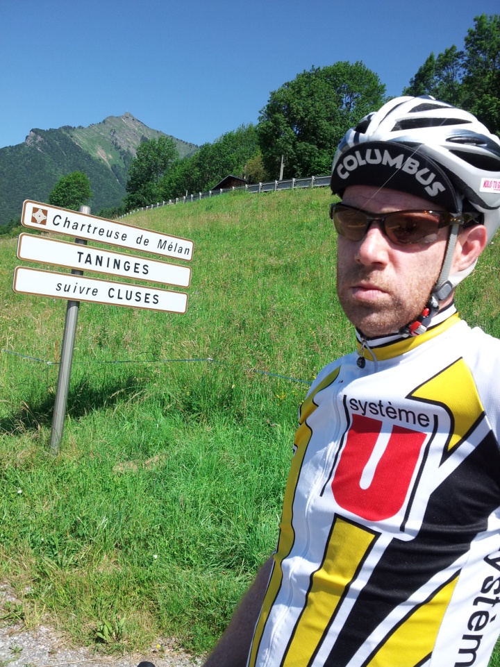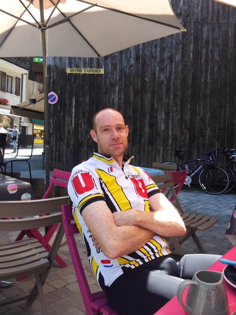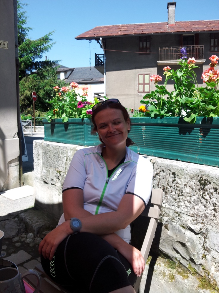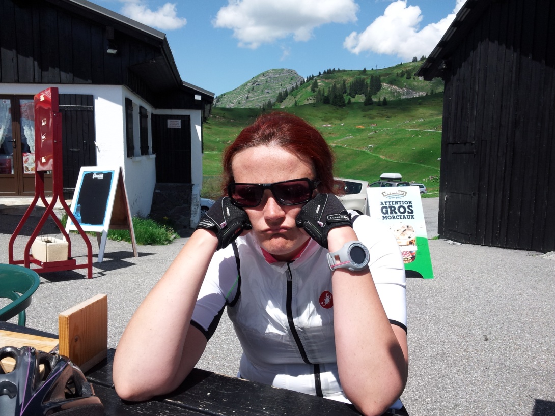 At the top, I made it, just about. The hardest thing I have ever done, the scary thing is that was only one mountain, I’ve got 18 to climb in September. I have to say it was a pig of mountain, Mark didn’t give me any info on it, he saved it all till we got back and then let me read what professional cyclists wrote about the Col Joux Plane. Let’s say it did make me feel a little better.